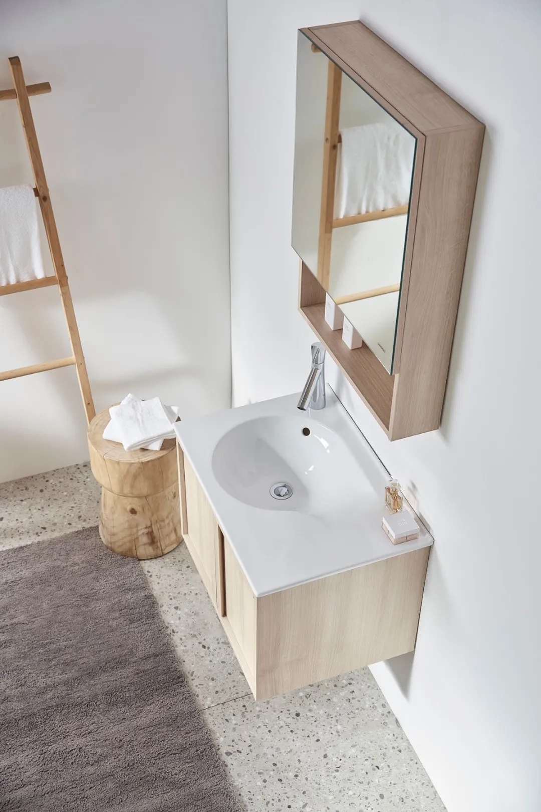 大自然創造了豐富的形狀,設計融入圓形幾何和水滴造型,流線斜坡設計改善了臺面積水的問題,相比傳統臺盆創造出新的使用方式。人們習慣使用右手,因此臺盆以側邊水滴盆腔設計,右側為寬敞的置物臺面,日常物品可順手取得。